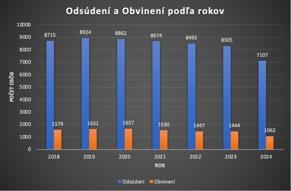 Pohľad na tieto údaje ukazuje, že v priebehu sledovaného obdobia došlo k pozvoľnému, ale trvalému znižovaniu počtu odsúdených aj obvinených osôb. Kým v rokoch 2018 až 2021 sa celkové čísla pohybovali nad hranicou 10 000 osôb, od roku 2022 už tento prah nebol prekročený. Najväčší medziročný pokles možno pozorovať medzi rokmi 2023 a 2024, kde počet odsúdených klesol o viac než 1 000 osôb a počet obvinených o takmer 400 osôb. Tento trend môže byť dôsledkom viacerých faktorov, napríklad legislatívnych zmien, zlepšenia prevencie kriminality, demografických pohybov alebo zmien v spoločensko-ekonomickom prostredí.