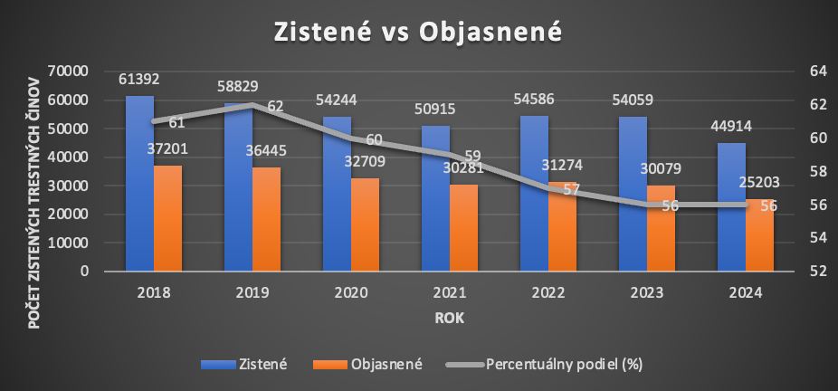 V roku 2024 bolo zistených 44 914 trestných činov, z ktorých sa podarilo objasniť 25 203 trestných činov, čo predstavuje percentuálny podiel objasnenosti na úrovni 56 %. Oproti predchádzajúcim rokom je vidieť pokles v absolútnom počte zistených aj objasnených prípadov, avšak miera objasnenosti zostáva na stabilnej úrovni podobnej ako v roku 2023. Tento trend naznačuje, že hoci celkový počet trestných činov klesá, efektivita objasňovania sa udržiava bez výrazného zhoršenia.