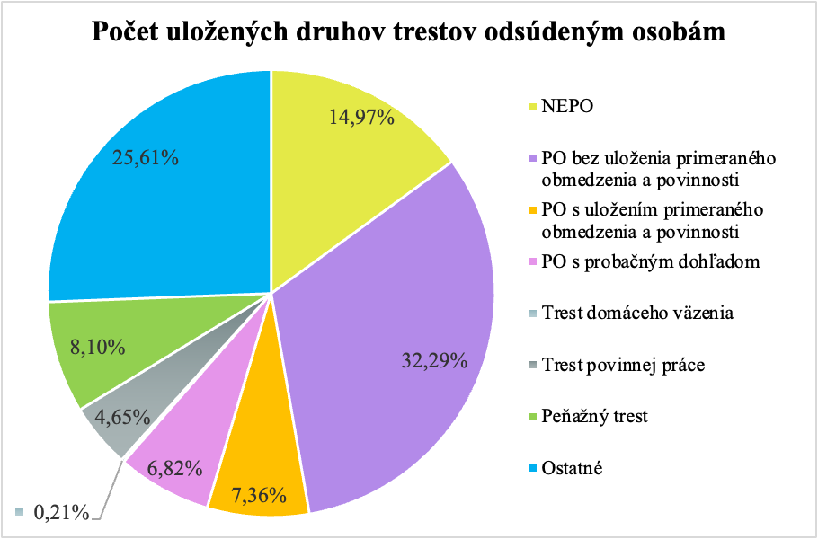 Najčastejšie ukladaným druhom trestu bola podmienečný trest odňatia slobody (PO) bez uloženia primeraného obmedzenia a povinnosti, ktorý tvoril až 32,29 % všetkých trestov, čo predstavuje 8 910 prípadov. Tento údaj poukazuje na preferenciu súdov riešiť menej závažné prípady prostredníctvom miernejších sankcií, ktoré umožňujú odsúdeným viesť život na slobode.
